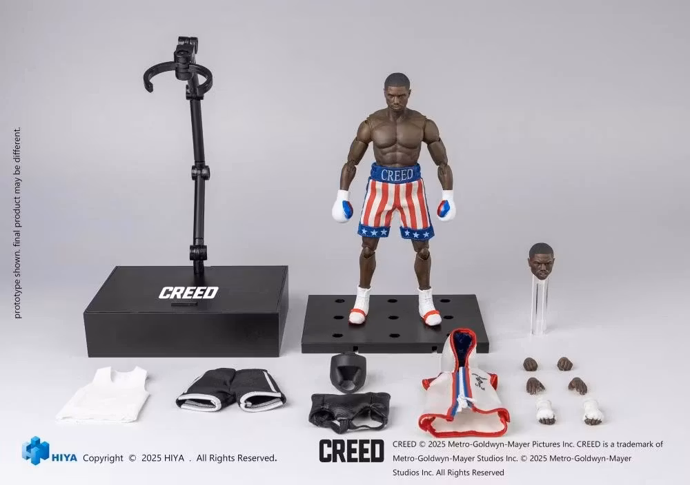 Den här helt nya actionfiguren i skala 1/12 är 16 cm hög och återskapar troget Adonis ikoniska utseende från filmen. Med ett seriöst uttryck och skulpterad muskulös kroppsbyggnad, bär figuren stjärnspäckade boxningsshorts, tillsammans med moderna sneakers och vita atletiska strumpor - som ett eko av arvet från hans far. Designen blandar klassisk symbolik med modern stil och fångar Adonis identitet som både en hyllning och en ny mästare.