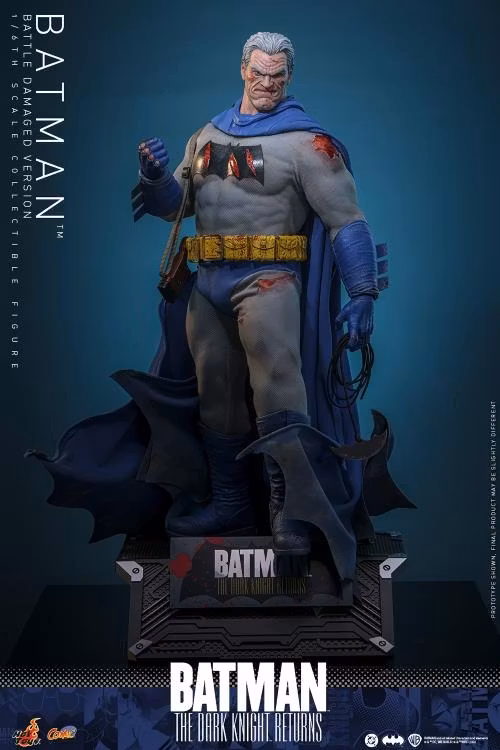 För att fira denna milstolpe är Hot Toys glada att kunna presentera Batman™ (Battle Damaged Version) Sjätte Skala Samlarfigur. Den sjätte skalan innehåller en nyutvecklad Bruce Wayne-huvudskulptur med separata rullande ögon och blodfärg som förmedlar stridens lidanden. Ett extra blått Batman-huvhuvud har tre utbytbara nedre sidor, vilket gör det möjligt för samlare att återskapa ögonblick direkt från sidorna i den ikoniska serien. Figuren har en specialiserad muskulös kropp som är byggd för att förmedla styrkan och fysiken hos denna äldre, stridshärdade Mörka Riddare. Sex utbytbara handskbeklädda händer med blodfärg stödjer ett brett spektrum av dynamiska stridsposer, inklusive nyutvecklade stridsskadade nävar, öppna gesthänder och vapenhållande händer.