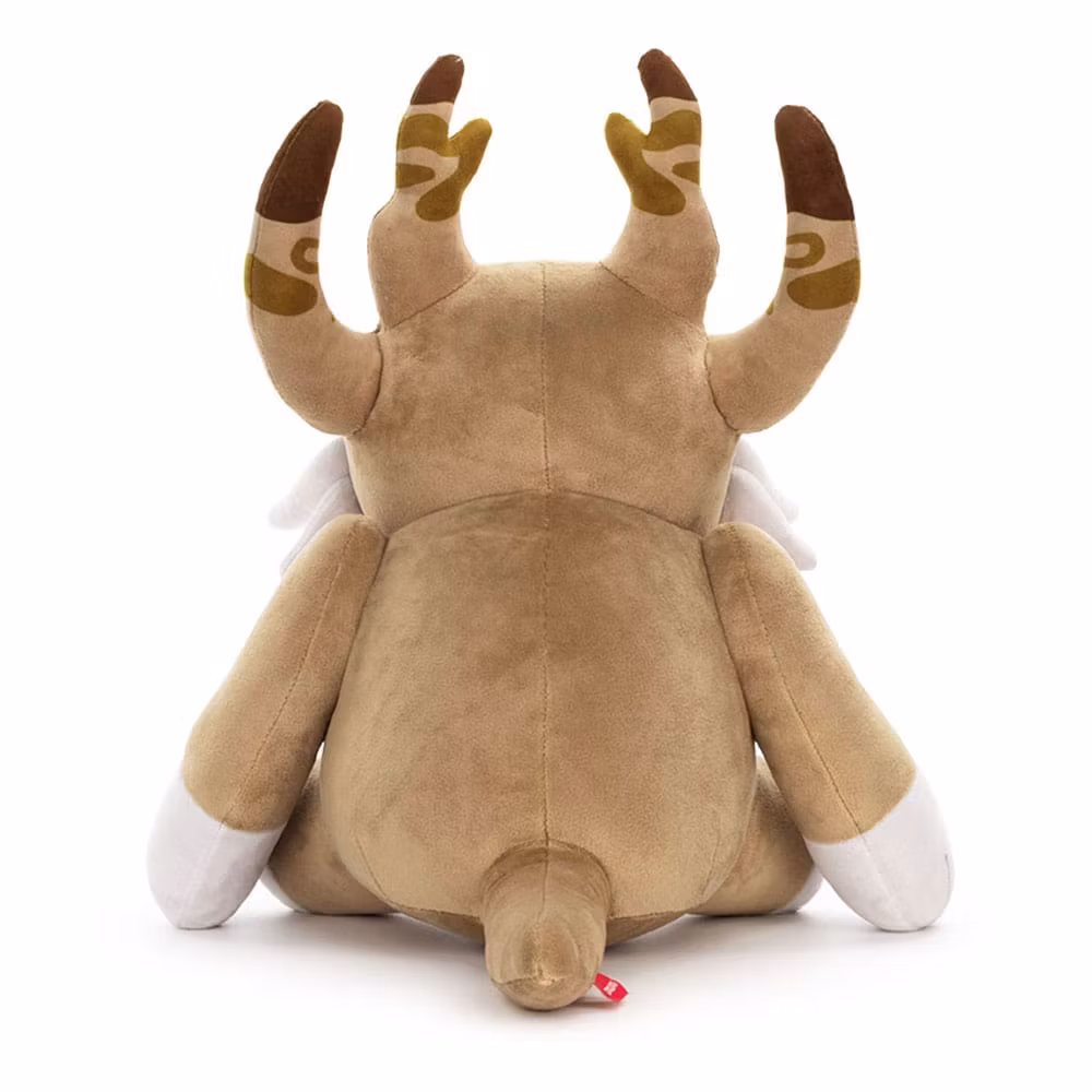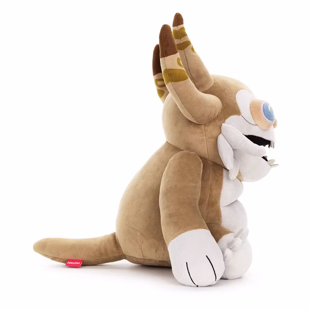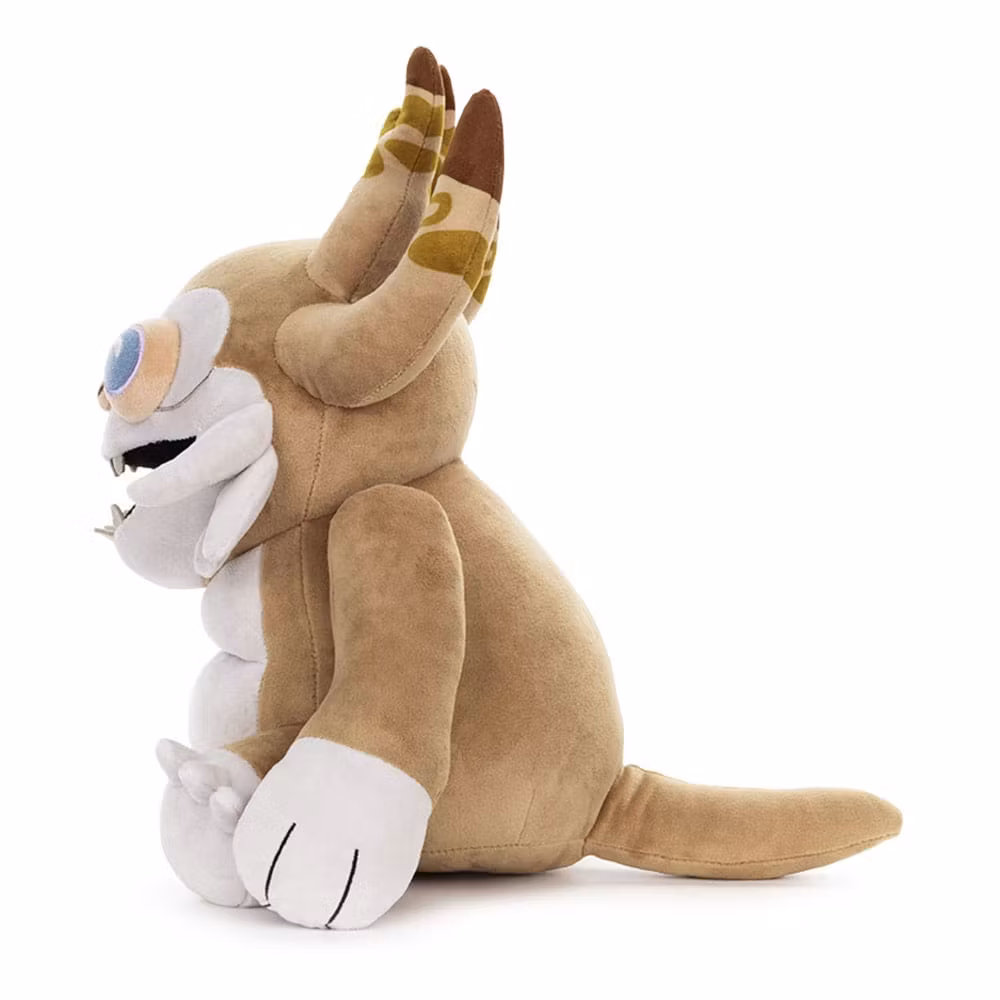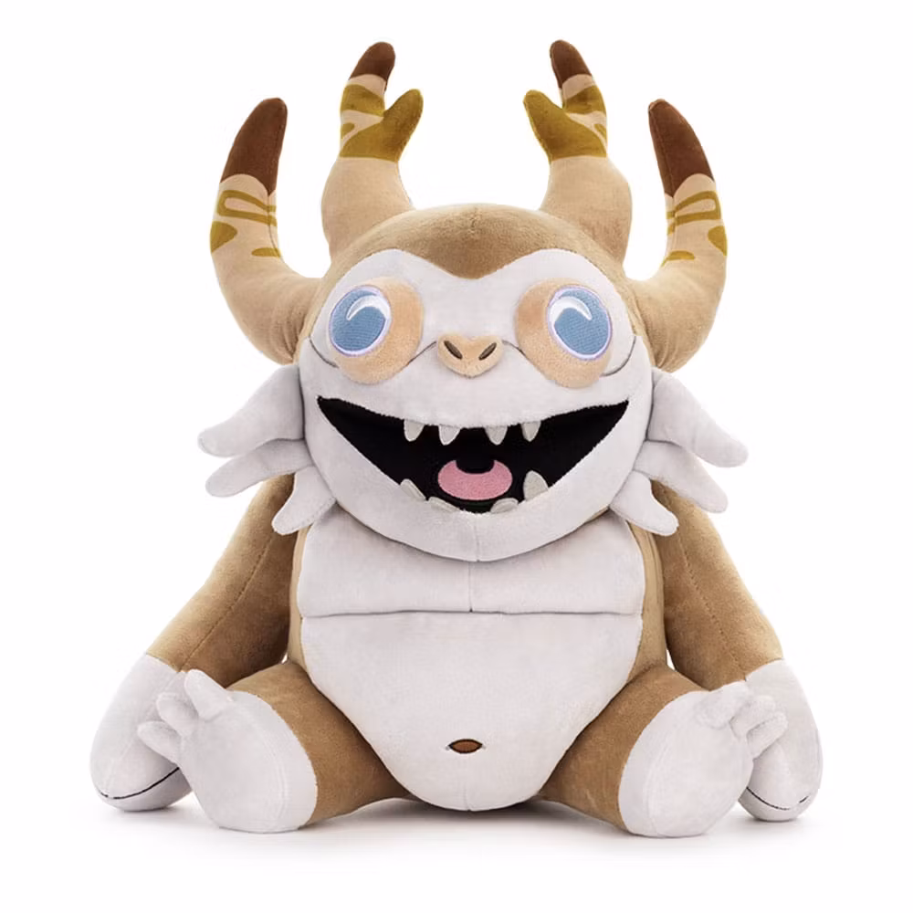 Aww, look at how cute he is! He's going to stay this size... right? Sitting hunched forward at 9 inches tall with small teeth poking out from the huge open smile on their pale face, a pair of bulbous blue eyes look in different directions on either side of a round nose. With four long horns that have brown markings on their tips reaching out from the top of their head, solid arms hang to the sides of a large folded torso as a long tail reaches out from their back. This plush is packed to the seams with 100% PP cotton and is made of the softest minky material, absolutely perfect for cuddling or smashing some things with!