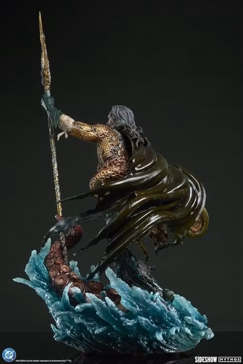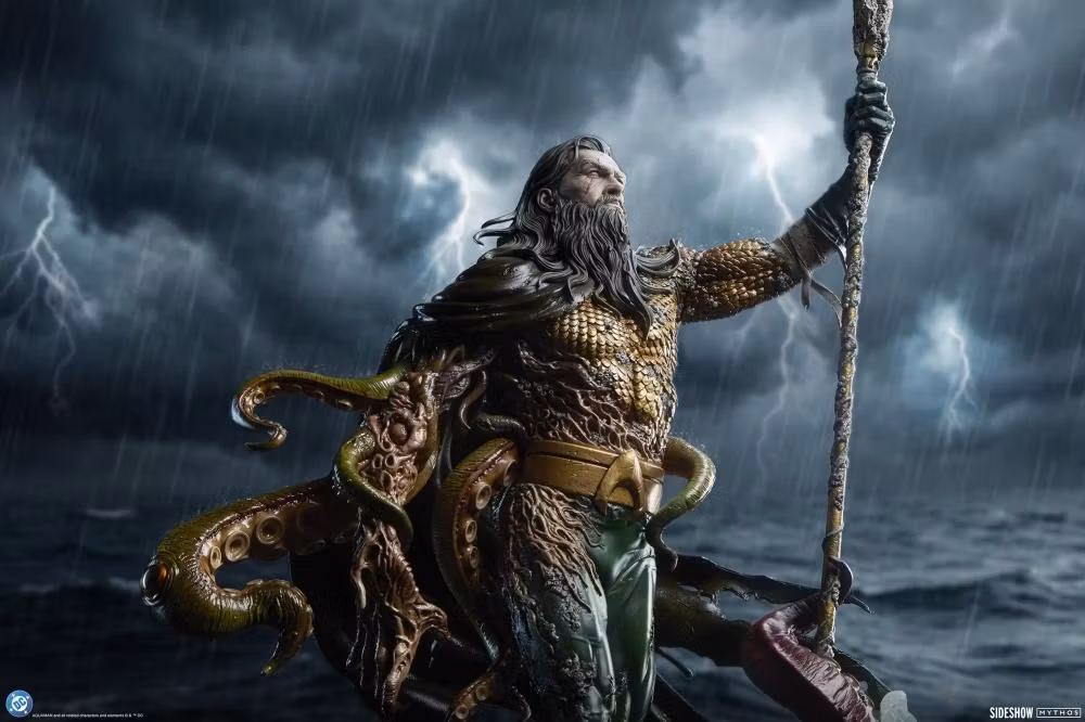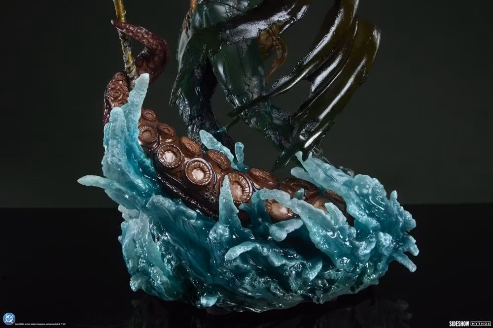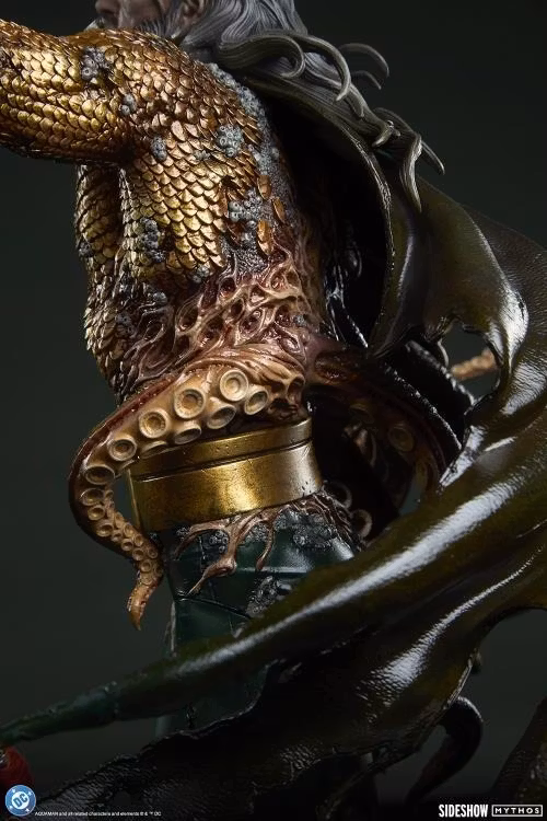 Inspirerad av karaktärens serietidningsutseende presenterar den fullt skulpterade DC-statyn en kuslig väktare täckt av kräftdjur, fiskfjäll och andra kallblodiga komponenter. Sliten metallisk färg på hans rostiga rustning ekar ett skeppsvrak som länge glömts i havsbottens kalla, obarmhärtiga raviner. Aquaman svingar en väderbiten guldtreudd när han marscherar framåt, redo för strid och bärande alla ärren från sitt förflutna. En röd bläckfisk ansluter sig till honom från famnars djup, och när hjältens egna gröna tentakler ansluter sig till den blir människan myt ... blir ett monster.