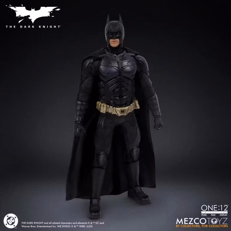 Batman är utrustad i en verklighetstrogen, taktisk pansardräkt med skulpterad plätering och en poserbar mantel, med detaljerad rustning från hals till känga. För första gången i en One:12 Collective-figur har Batman helt nya utbytbara ansiktsuttryck och okular som möjliggör en mängd distinkta ansiktsuttryck. Ett omaskerat Bruce Wayne-porträtt ingår med en avbild av Christian Bale.