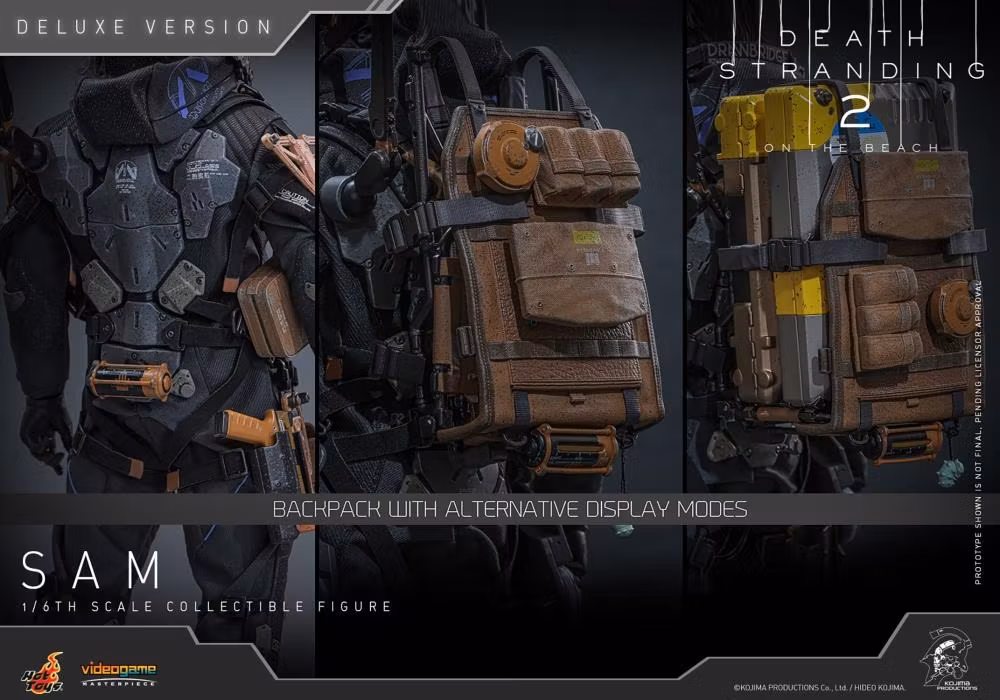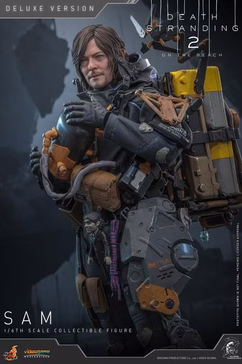 Hot Toys proudly introduces the 1/6th scale Sam Collectible Figure (Deluxe Version) — an upgraded version overflowing with additional accessories and enhanced display options. Just like the Regular version, this action figure features a head sculpt with rolling eyeballs and meticulously crafted dark brown hair, a Drawbridge suit with UV luminous reflective effect, full-body utility harness, detachable Battle Skeleton, back armor with Odradek scanner, and transporter boots — all weathered for worn realism.