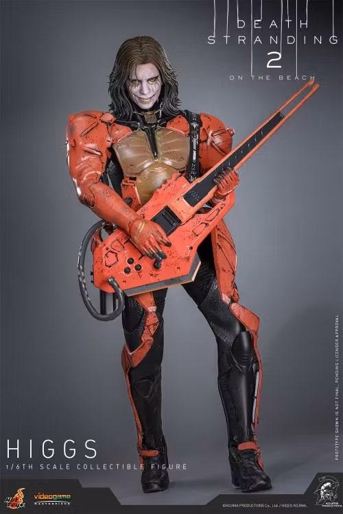 Higgs kommer utrustad i sin signaturdräkt med orange pansardelar inklusive armar, bröst, mage, rygg, lår och ett par exoskelett. Kommer också med ett guldhalsband, Odradek, stövlar och en röd mask för alternativa visningsalternativ. Nio stycken utbytbara händer gör det möjligt för samlare att visa upp honom i avslappnat, gitarrspelande, stridsställningar och mycket mer. Han är beväpnad med en pistol och sin ikoniska stridsgitarr – ett vapen och ett statement som förkroppsligar hans teatraliska persona – som kan fästas med tillbehör som en gitarrrem och en sträng av Higgs mage som förbinder gitarren med hans midja. Hela setet presenteras på ett specialdesignat Death Stranding 2-figurställ.
