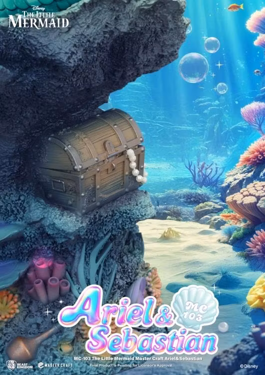 This Master Craft statue captures the classic scene from The Little Mermaid, with Ariel singing atop a coral reef and Sebastian by her side. High-precision 3D sculpting faithfully recreates her flowing red hair, layered tail scales, and expressive face, while Sebastian is brought to life with vibrant detail. The hand-painted finish gives her seashell top and emerald tail a beautiful shimmer, and the seabed base—complete with sand, corals, and a hidden treasure chest—adds rich storytelling depth.