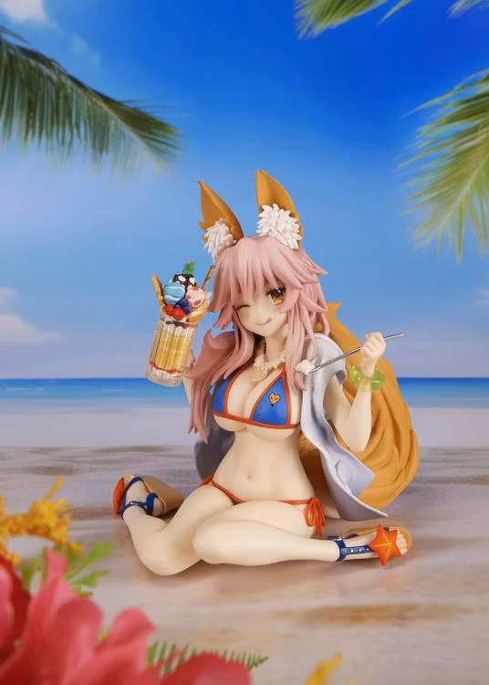From the popular Fate/Grand Order video game comes the Lancer/Tamamo no Mae figure by Flare! This figure displays the character in a blue and red swimsuit, as she sits down at the beach with a tasty treat. Tamamo no Mae stands around 6 inches tall and is intricately detailed to capture the character's look from the game. Be sure to add this figure to your collection!