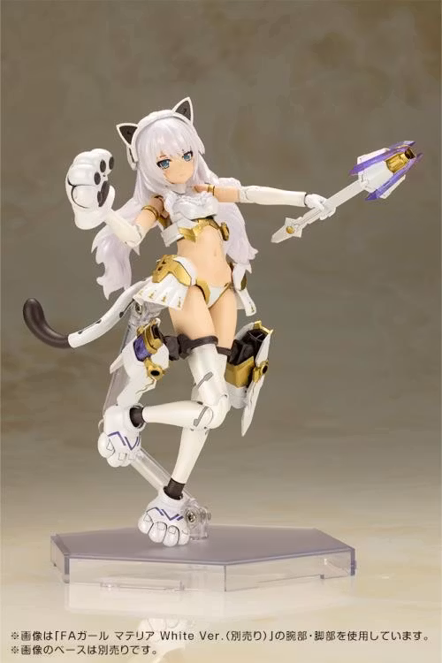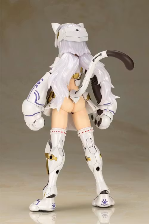 Frame Arms Girl Durga I suits up in Cat Armor Unit 01 featuring revised parts and colors! You can create a large variety of unique armor sets by combining additional armor and cat armor parts. The arms and legs of the cat armor can be displayed with or without claws and cat paws can be created from the arms of the cat armor. The tail has four points of articulation, allowing for a wide variety of expressive poses and includes parts that allow the base of the tail to be connected to the standard kit parts or displayed with the included simple round base and the New Flying Base (sold separately). The model can also be assembled in the regular Durga I configuration.