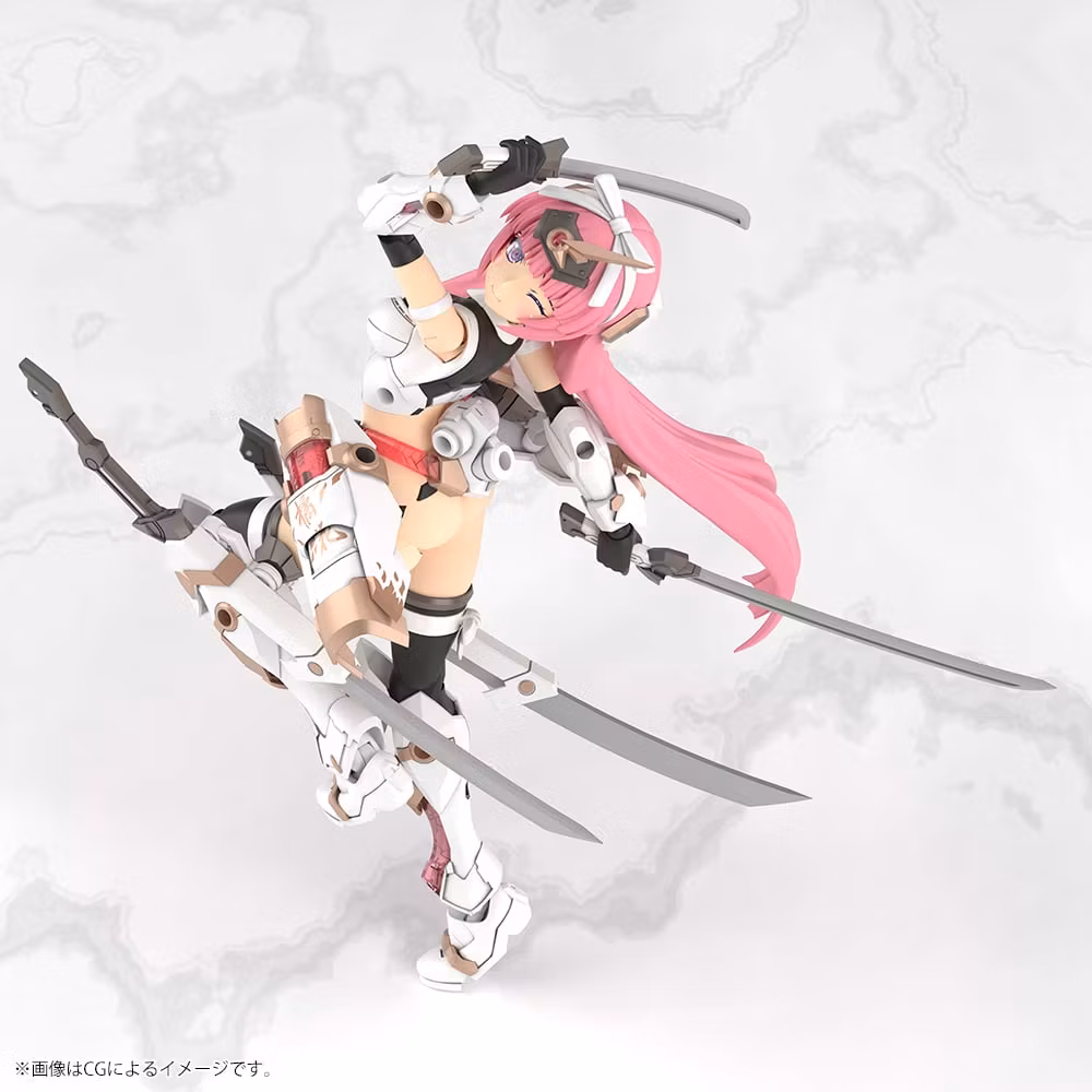 The 5mm joints enable this model to be assembled into the default form as well as a special “Kunoichi Mode.” Includes two sets of special weapons, Tenkai (long swords) and Satsuga (short swords), with the weapons being able to be sheathed and unsheathed without changing out parts. Joint parts are included to attach the long sword Tenkai to the model’s heel.