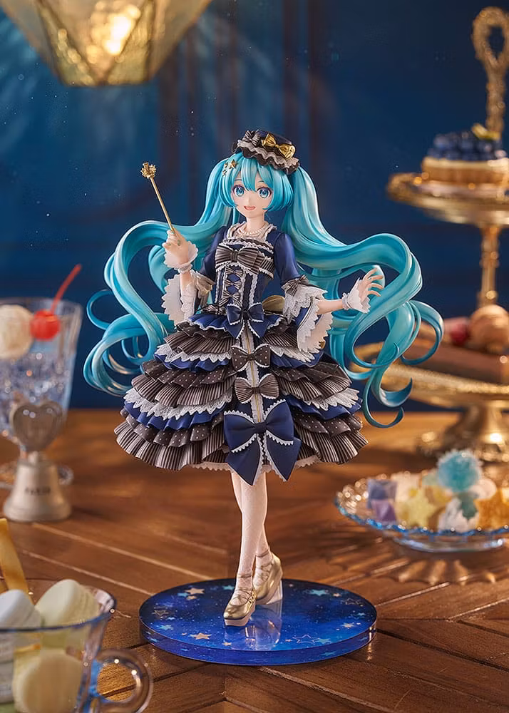 From Character Vocal Series 01: Hatsune Miku comes a 1/7 scale figure of Hatsune Miku wearing the popular BABY, THE STARS SHINE BRIGHT designed Shooting Star a la Mode dress, as drawn by illustrator En Morikura. The dress has been faithfully recreated, with meticulous attention paid to every detail, even down to the frills and lace. Miku's flowing twintails have been painted with a pearlescent finish for an added air of elegance. Be sure to add this special Hatsune Miku figure made in collaboration with a popular apparel brand to your collection!