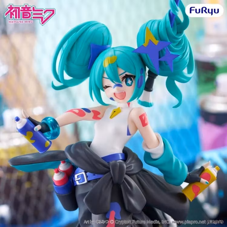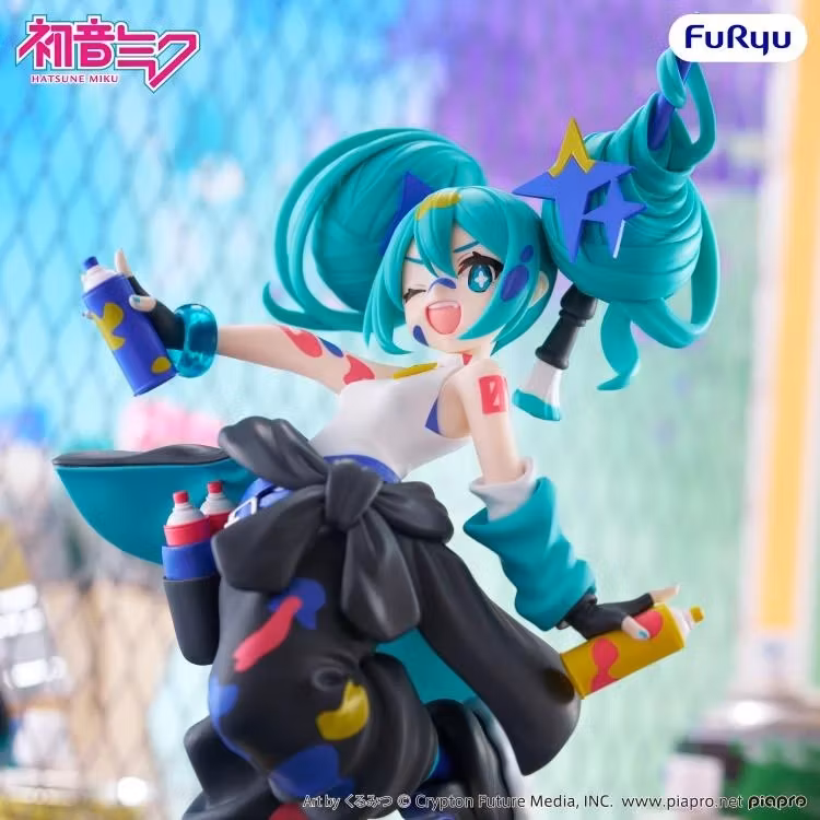 FuRyu invites you to add some color and chaos to your collection with their brand new Muchute line of figures and who better to start off the series than the international virtual popstar Hatsune Miku! Designed in a new cartoon-y style, Miku is depicted decked out in graffit gear and covered in paint as she finishes up her latest creation on a nearby wall. Winking at her friends for another job well done, the creative minds at FuRyu truly bring this vibrant figure to life with plenty of joy and excitement! Add some colorful vibes to your collection and order your figure today!