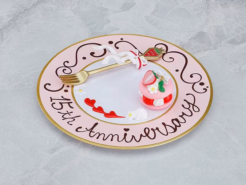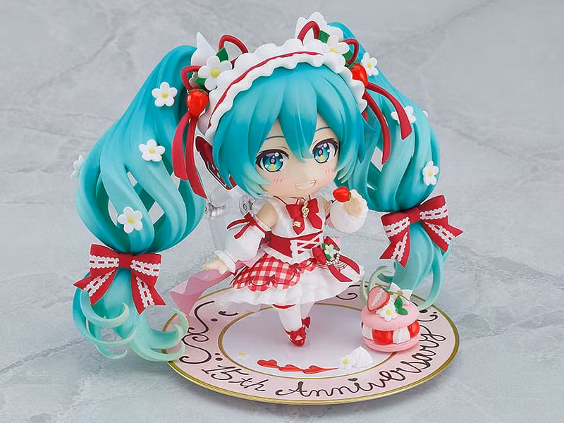 Hon kommer med tre ansiktsplattor inklusive ett standardansikte, ett leende ansikte och ett saligt nöjt ansikte. Valfria delar inkluderar en gaffel med jordgubbstema, en figurbas som ser ut som en desserttallrik och en läcker macaron! Mikus underbara outfit prydd med jordgubbar och volanger och hennes twintail-frisyr har troget fångats i Nendoroid form.