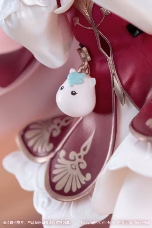 Beneath the wine-red outer dress, delicate white lace accents flutter softly. With every light step Hyacine takes, the hem dances gently in the breeze. Atop her exquisite hat, pearlescent feathers symbolizing tenderness mingle with metallic-hued blossoms of resilience — together conveying the unique healing power that belongs to Hyacine alone.