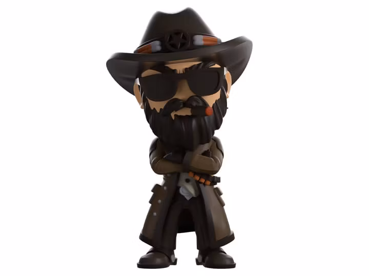 Need some new threads? Maybe some armor?? Well Trader Joel’s got you covered with his Youtooz debut! Standing at 4.8 inches tall with his arms crossed and a fat cigar poking through his thick black beard, a pair of dark sunglasses cover his frowning eyes and a brimmed hat sits on top of his head. Wearing a long dark green coat with black trim and a high collar, a bandolier is wrapped over his torso as an untucked shirt hangs over his belt the hems of his pants sit above strapped boots.