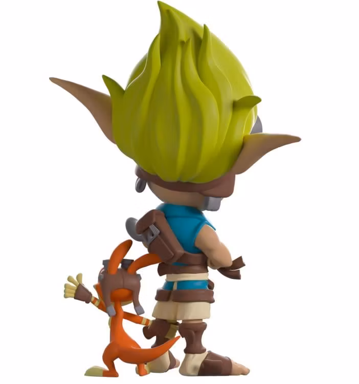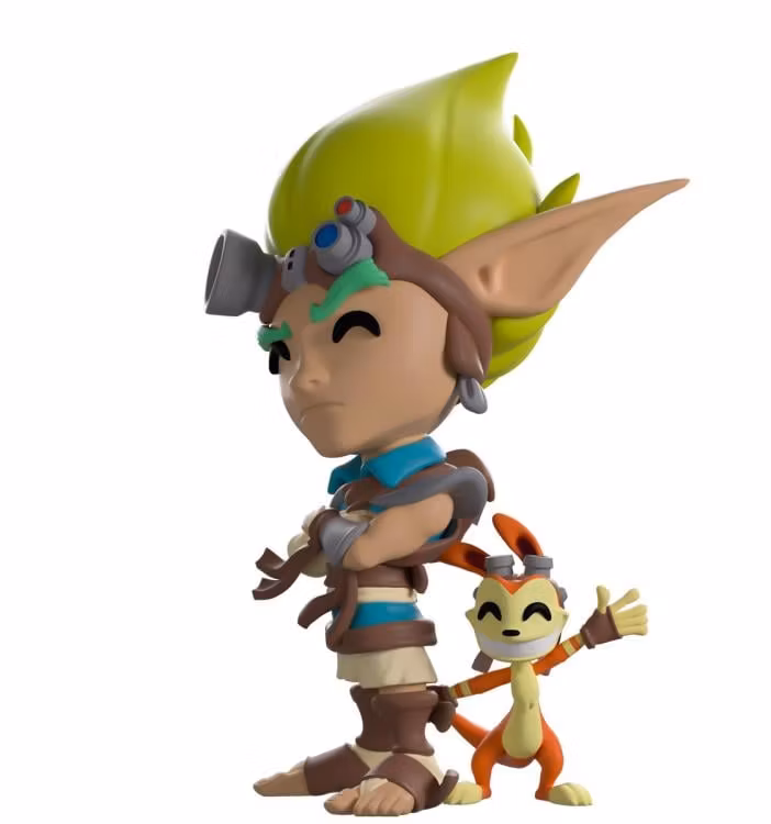 Jak och Daxter har följt spåren av Precursor Artifacts här och har hittat den största skatten av alla, en Youtooz-debut! Jak är 5,3 centimeter lång och har armarna i kors över bröstet och ett självbelåtet litet leende korsar Jaks ansikte under ett höjt grönt ögonbryn när hans långa hår och spetsiga öron sträcker sig ut ovanför de bruna glasögonen. Iklädd en ärmlös blå topp och beige shorts som är täckta av böljande bruna band, står en upphetsad Daxter vid hans sida och slänger förtjust ut armen medan ett fräckt leende sprider sig över hans bleka ansikte och långa orange öron och svans sträcker sig bakåt.