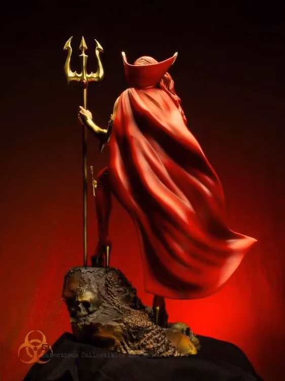 Now, Quarantine Studio immortalizes her striking presence with this 1/5 scale collectible statue, bringing Lady Satanus to life in exquisite detail. Standing a commanding 17 inches tall from her molten rock base to the gleaming tip of her chrome gold trident, she dominates the scene with a highcollared cape, intricate costume detailing, and a gaze that could freeze Hell itself.
