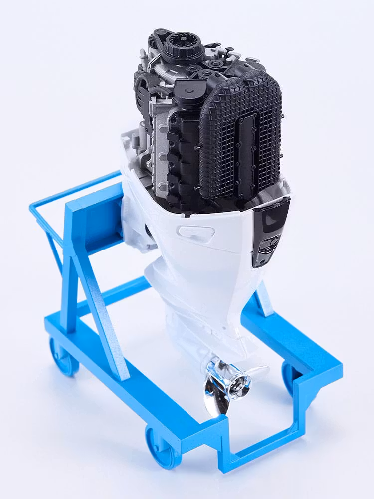 Introducing a plastic model kit of the BF350, the flagship model of 4-stroke outboard motors by Honda Motor Co. and the original character Minori by Shunya Yamashita, sculpted in the same scale. Minori, wearing her rash guard, can be displayed taking a break or in maintenance mode. The front zipper of the rash guard can be displayed open or closed for a total of four different display options. The model is made with white plastic to replicate the sporty white exterior of the Honda BF350. The model was sculpted based on the actual product, resulting in a faithful recreation of the large and sleek Noble Motion Form design. The V8 engine (displacement: 4,952 cc, maximum output: 350 HP), the most distinctive feature, has also been carefully and realistically reproduced. As with other minimum factory models, the BF350 and Minori can be easily customized with the various colored parts and decals included in the kit! Be sure to add the perfect combination of mecha and figures to your collection!