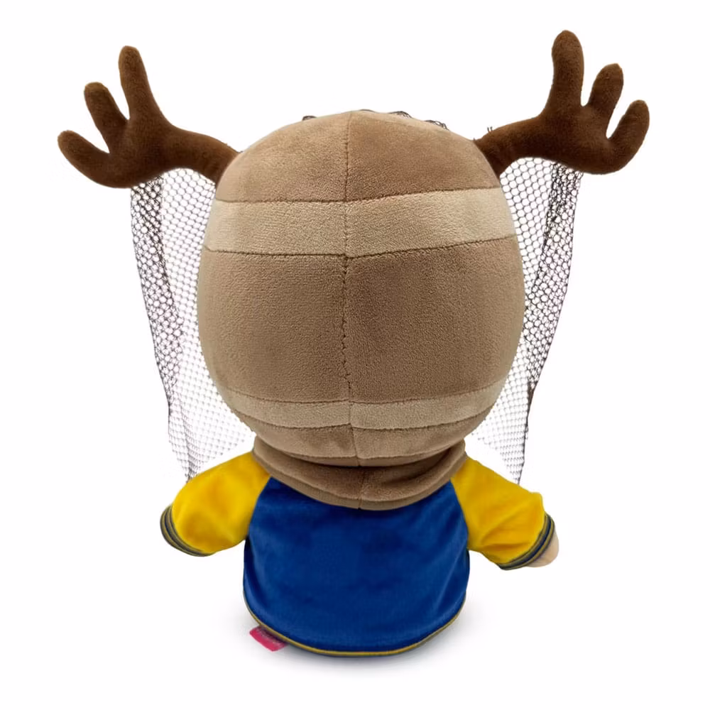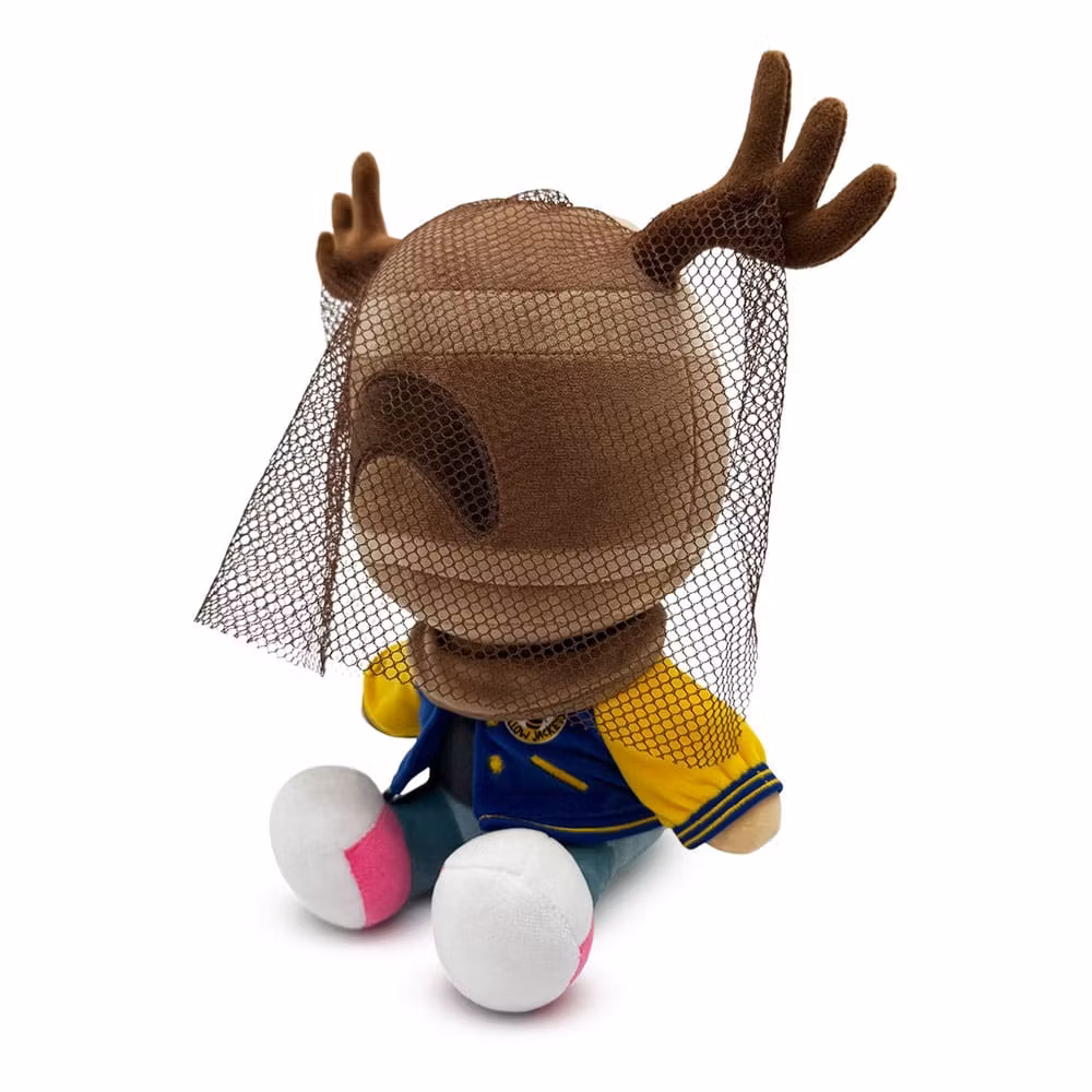 Youtooz has stumbled into a strange ritual in the thick of the forest and been confronted by the most mysterious plush! Sitting at 9 inches tall with their face obscured by a thick striped mask as curved brown antlers rise from the top of their head, a thin fishnet drapes down past their shoulders to shroud them in true mystery. Wearing a puffy varsity jacket with bright yellow sleeves and a blue torso that has a wasp on the chest, their blue jean wearing legs kick forward as pink and white sneakers cover their feet. This plush is packed to the seams with 100% PP cotton and is made of the softest minky material and fishnet, absolutely perfect for cuddling or being mysterious with!