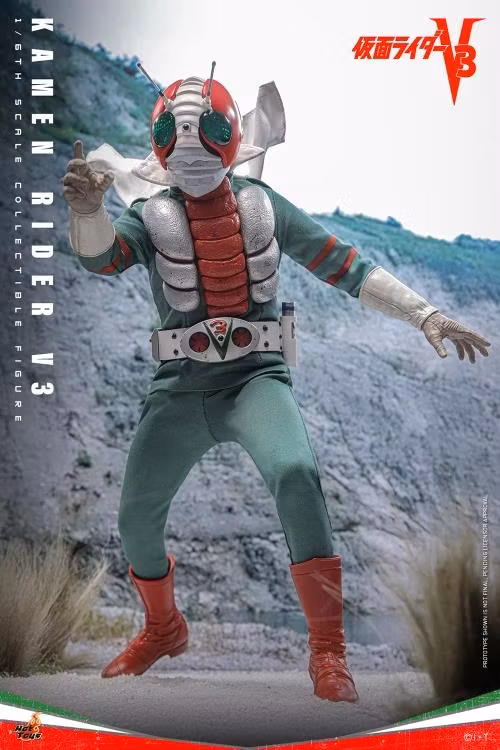 Hot Toys är stolta över att presentera Kamen Rider V3 Sixth Scale Collectible Figure. Den här actionfiguren har en V3-hjälm med LED-belysta gröna ögon och en huvudskulptur av Hiroshi Miyauchi som Shiro Kazami med separata rullande ögonglober, vilket ger uttrycksfull realism till V3:s beslutsamma blick. Kamen Rider V3 tar på sig sin signatur livfulla gröna dräkt med väderbitna Redbone och Converter Lung, tillsammans med trådinbäddade kragar och korta kappor som ger dynamisk stil. Det magnetiskt aktiverade Double Typhoon Henshin-bältet är LED-belyst och är utrustat med ett V3 Hopper-hölster, som återskapar hans ikoniska förvandlingssekvens. Figuren innehåller tio utbytbara händer, inklusive knytnävar, öppna händer, V-teckenställningar, pekande finger, knivhandslagsgest och en hand för att hålla V3 Hopper. Tillbehören inkluderar V3 Hopper-satelliten (både i hölster och i utfälld form), ett hjälmtillbehör som Shiro Kazami kan hålla i, en Kamen Rider Kid Corps-hatt och medaljong samt ett figurställ med V3-logotypen och namnskylten. En specialutgåva som endast är tillgänglig på utvalda marknader kommer att innehålla ett specialdesignat Kamen Rider V3-samlarkort i metall med vitrin.