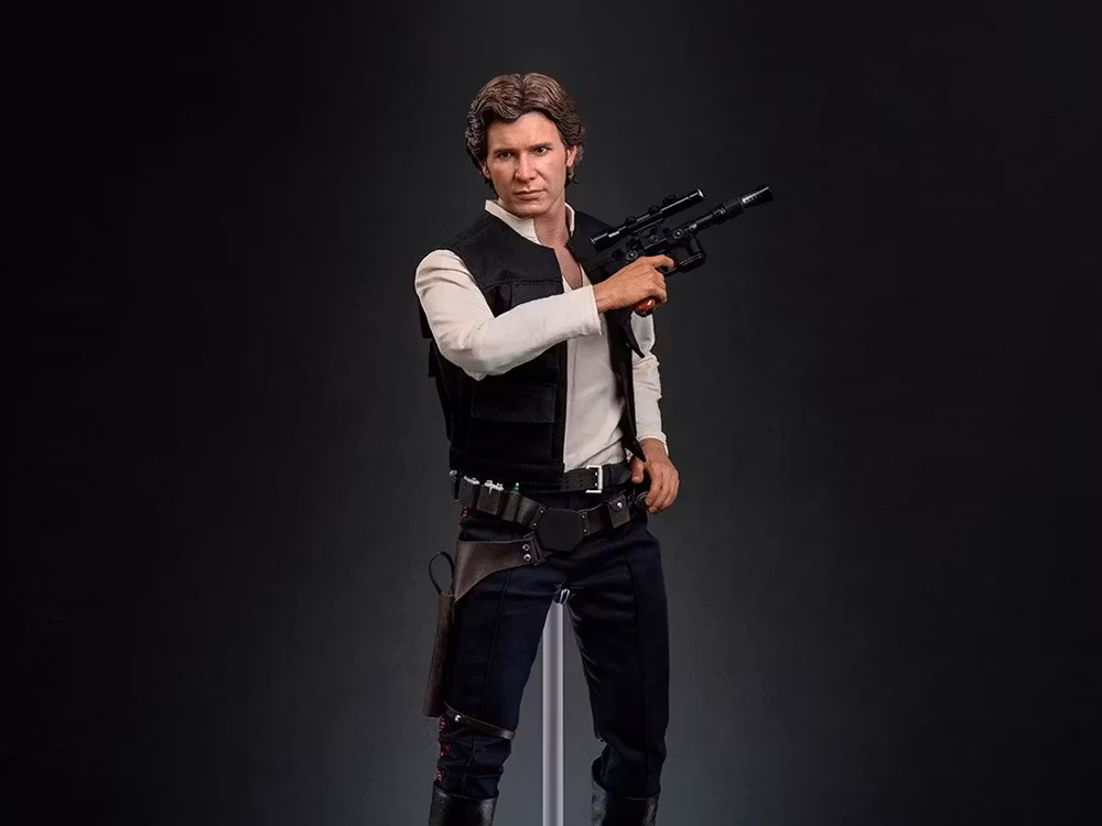 Han Solos outfit är troget skräddarsydd och består av hans väst lager på lager över en V-ringad skjorta, byxor och ett svart äkta läderbälte. Det bruna läderbältet är rikt dekorerat med ett silverspänne, greeblies och ett läderblasterhölster, kompletterat med ett par långa läderstövlar som fulländar hans smugglarutseende. När det gäller vapen är Han utrustad med sin signatur DL-44 Blaster Pistol och ett E-11 Blaster Rifle, medan tillbehören inkluderar en droid-caller och ett Stormtrooper-verktygsbälte med ett läderhölster för blaster. Figuren i kvartsskala visas på en upphöjd figurbas med tema Millennium Falcon och en miniatyr av Millennium Falcon, Star Wars-logotyp och namnskylt, vilket gör detta till en omisskännlig mittpunkt för varje samling.
