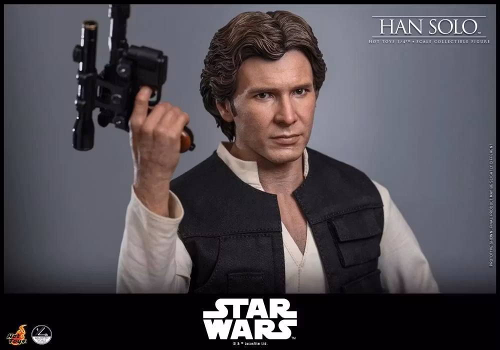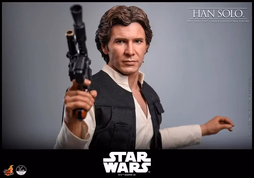 Hot Toys presenterar stolt Han Solo™ Quarter Scale Collectible Figure och fångar Harrison Fords gestaltning med anmärkningsvärd realism. Denna figur i kvartsskala har en nyutvecklad huvudskulptur med separata rullande ögon, detaljerat ärr och livlik hudstruktur. Hans bruna korta frisyr är noggrant skulpterad för att spegla hans klassiska look från A New Hope. Med en längd på cirka 45,5 cm gör den nyutvecklade kroppen det möjligt för samlare att återskapa Hans karakteristiska swagger- eller blaster-redo ställningar. Ett omfattande urval av utbytbara händer, inklusive fyra vanliga händer, tre handskbeklädda händer samt sex händer med underarmar, ger mångsidiga möjligheter att visa upp direkt från Mos Eisley Cantina eller in i stridens hetta.