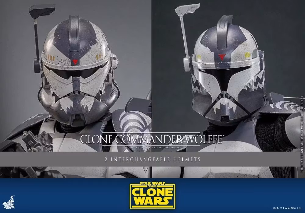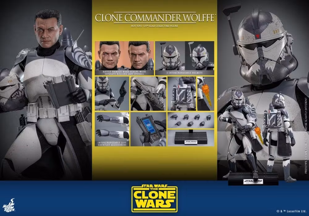 Den mycket exakta Clone Commander Wolffe-samlarfiguren har karaktärernas unika rustning och hjälm med vädereffekter och distinkta markeringar, en huvudskulptur med realistisk likhet, utbytbara hjälmar och handsketillbehör för att återskapa fas-I- och Fas II-rustningens utseende, ett blastergevär, ett par blasterpistoler, en jetpack, en datapad och en displaybas!