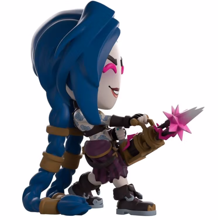 Jinx har anlänt till Youtooz för att göra den mest högljudda, vildaste och mest explosiva debuten vi någonsin sett! Hon är 4,3 tum lång och poserar och förbereder sig när hon släpper lös en konstant spärreld av rosa skott från gatlingpistolen som hon håller i sina handskbeklädda händer. Hennes mörka ögonbryn rynkas över ljusrosa ögon medan blått hår hänger över ansiktet i en tjock lugg och är knutet i långa hästsvansar med gyllene band för att vila på marken bakom henne. Klädd i en ärmlös svart topp, slitna lilarandiga byxor och tjocka stövlar med manschetter, dansar virvlande blå molntatueringar över hennes exponerade mellangärde och ner på hennes högra arm.