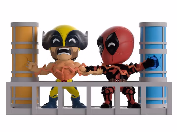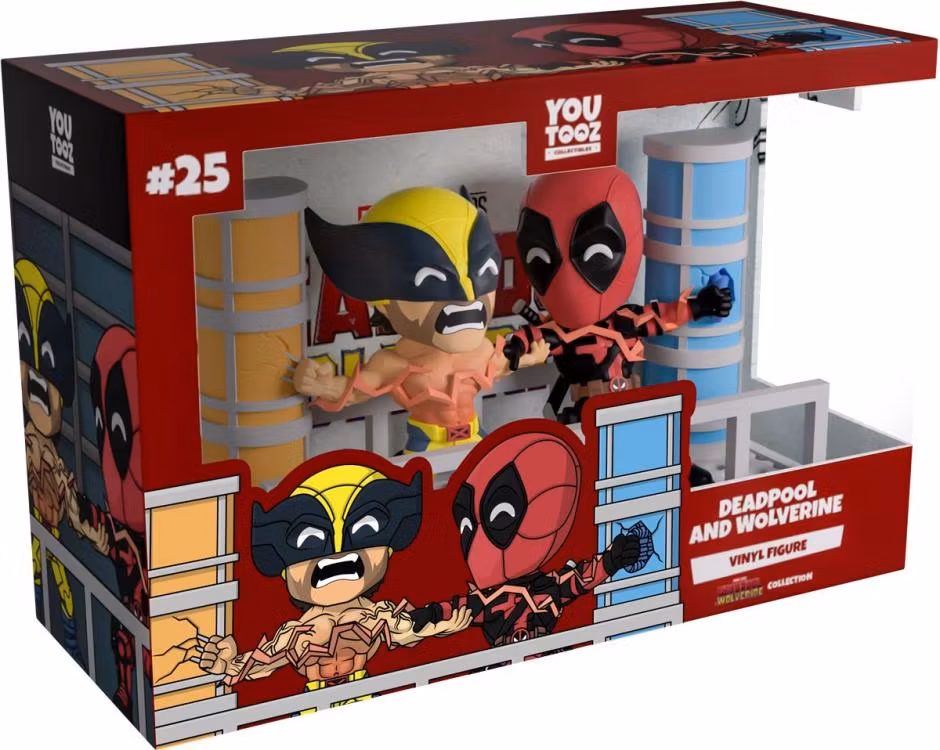 Can you feel the power of our latest Youtooz? Well can you?! Because Deadpool and Wolverine make their return with the most electrifying pair of figures we've ever unleashed! At 4.6 inches tall, this powerful scene sees Deadpool and Wolverine grasping each other's arms as they smash their hands (or claws) into the blue and yellow pillars at either side to let a dimension-ending power wrap through their bodies. With Wolverine letting out a pained yell from his mutton-chopped face as his bare chest glows red with electrical heat, Deadpool looks over to say some witty final words which are hidden by his thick red mask. The exterior of their packaging seems the pair between two colored pillars with electricity coursing across their bodies. While the interior mimics rough paper which Deadpool has scrawled over, this then continues onto the protective sleeve where their figures can be seen through the large clear window at the packaging's front. This collectible ships in a matte, embossed, protective outer sleeve and a custom-sized plastic protector for maximum protection during shipping.