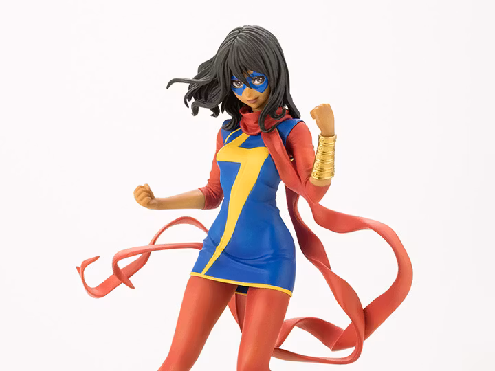 "Avenger från high school som idoliserar superhjältar, Ms. Marvel kommer tillbaka som en reproduktion! Kamala Khan var bara en vanlig gymnasieelev tills hennes krafter plötsligt vaknade efter en viss händelse. Den supersöta illustrationen till denna BISHOUJO-staty av Ms. Marvel, den unga hjältinnan som nyligen hamnade i rampljuset, skapades av konstnären Shunya Yamashita.