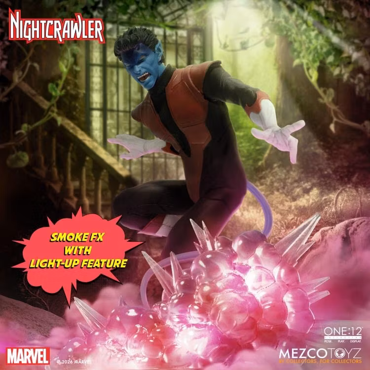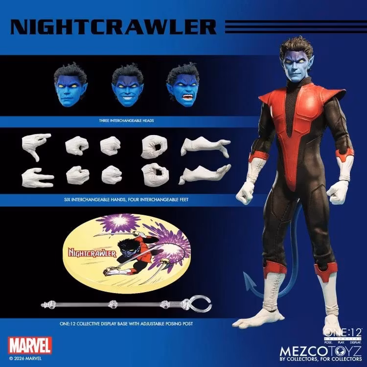 Den teleporterande mutanten Nightcrawler är klädd i en X-Men-utgiven stridsdräkt med lager på lager av mjuka plagg skräddarsydda speciellt för honom. Dessutom ingår flera huvudporträtt, utbytbara händer och fötter, fyra sabelsvärdsstilar och en lysande One:12 Collective-teleportationseffekt. Nightcrawler är redo att slå till utan förvarning—eller försvinna i BAMF!