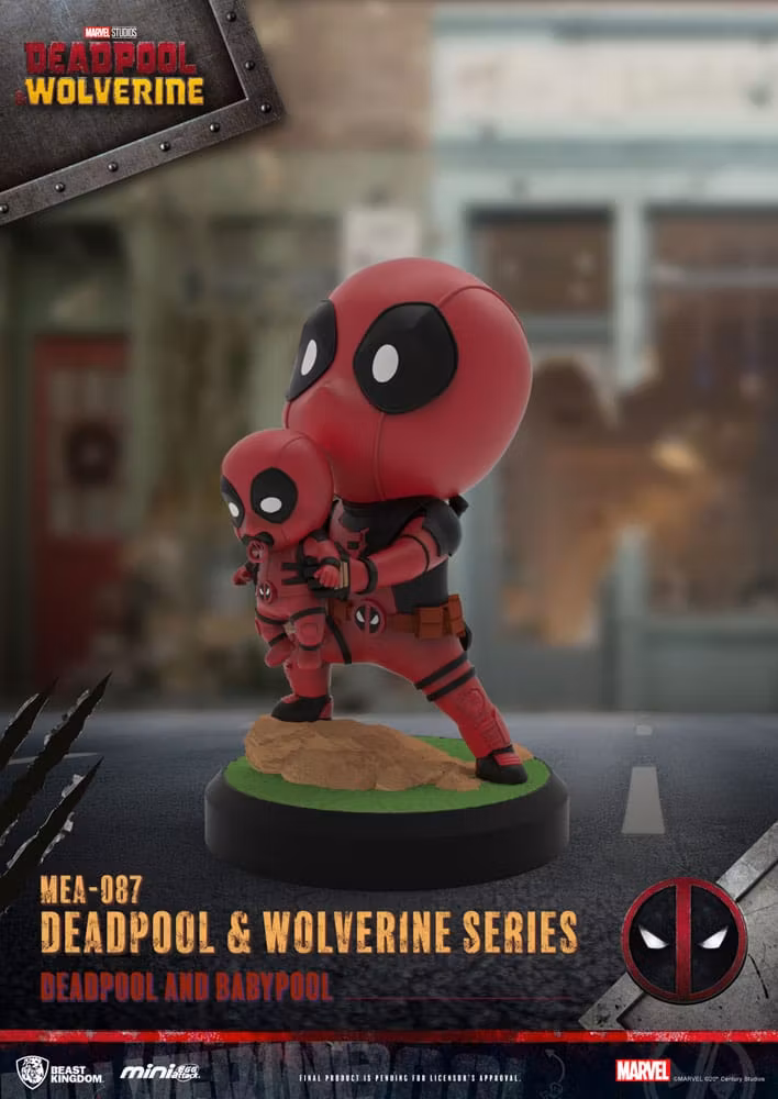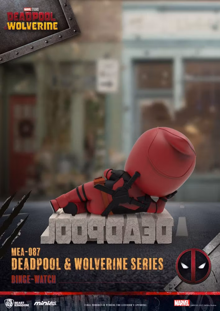 This set of 6 super-cute figures from the 'Mini Egg Attack' series by Beast Kingdom Toys comes from 'Deadpool 3'. The figures are made of PVC, are approx. 8 cm tall and come with a base. Set consists of: - 1 x 4711203455134 Dogpool - 1 x 4711203455141 Binge-watch - 1 x 4711203455158 Glory deadpool - 1 x 4711203455165 Kidpool & headpool - 1 x 4711203455172 Wolverine without mask - 1 x 4711203455189 Marry You