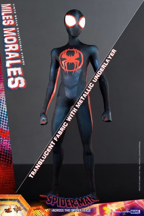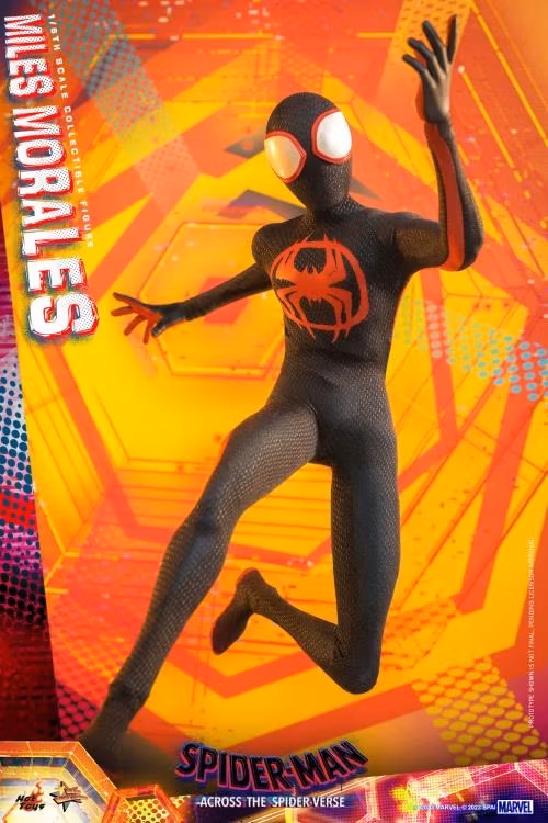 Den mycket poserbara figuren har en nyutvecklad Miles Morales-huvudskulptur med separat rullande ögonglobssystem och ett maskerat huvud med flera par okular för att skapa olika uttryck. En nydesignad kropp som visar hans fysik, kommer med en svart Spidey-dräkt som är speciellt gjord med ett halvtransparent men ändå töjbart tyg, medan det undre lagret ger en metallisk blå skimrande effekt. Hans trendiga outfit är troget återskapad genom noggrant val av tyg, från ytterrocken, hoodien, jeansvästen, jerseytoppen till denimjeansen och skulpterade sneakers. Mer detaljerade tillbehör inkluderar The Spot-dioramatillbehör, serietidning, diverse webbtillbehör, grafik med spindelsensoreffekt, bakgrund med multiversum-tema och ett dynamiskt figurställ.