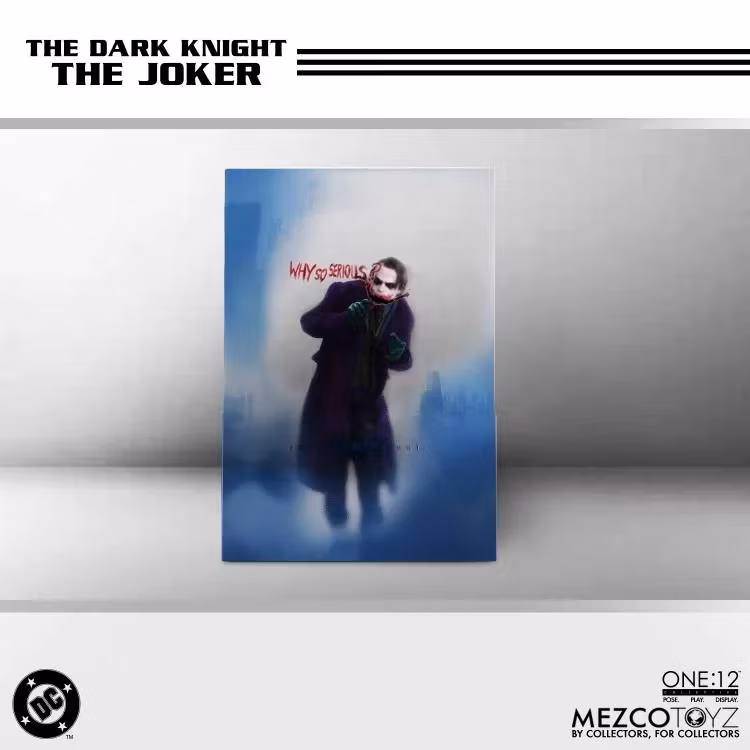 Den självutnämnda kaosagenten är beväpnad med ett sortiment av dödliga verktyg och skärmexakta tillbehör, inklusive granater, knivar, skjutvapen, kuleffekter och ett spelkort – Jokern tar med sig sin unika typ av kaos till Gotham. Hans kulsprutepistol och pistol har båda löstagbara magasin och FX-sprängeffekter för dynamisk posering. Återskapa den ikoniska reklamfilmsaffischen Varför så allvar? med den medföljande displaypanelen som Joker kan posera bakom.