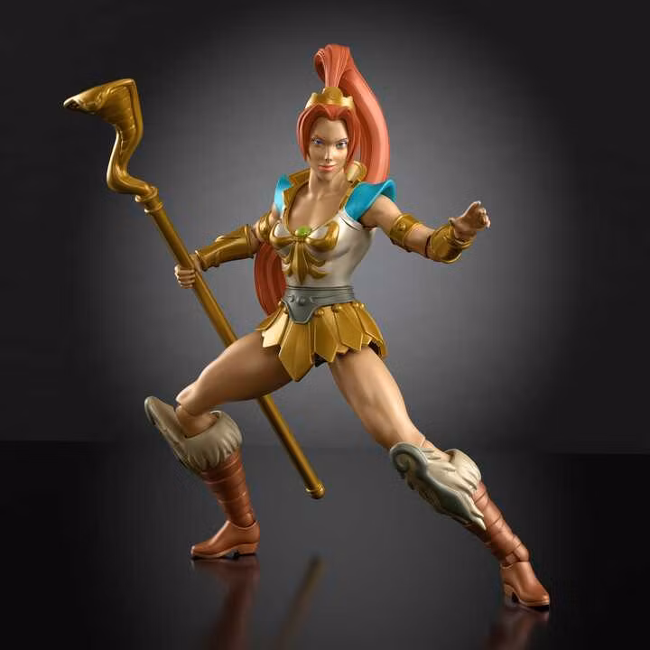 This Origins Teela action figure from the Cartoon Collection is inspired by the popular MOTU 200X action figures, which in turn are inspired by the TV series He-Man and the Masters of the Universe. This reinterpreted version of the toy released in 2002 has a retro style while also featuring modern movement capabilities. The heroic warrior goddess is designed to scale as an approximately 14 cm Origins figure, wears her hair in a long ponytail, and has 16 points of articulation as well as several interchangeable body parts. She has a staff inspired by the episode The Blood of the Sorceress. Color and design variations are reserved.