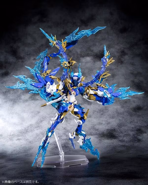 Well-received for the fully updated body and abundance of gear, Susanowo is now available with a variety of large and small effect parts. The vivid blue and white coloring puts a new spin on the dark color scheme of the original Susanowo. The face parts are all new expressions, giving users the experience of a whole new character. With blue flames erupting from her body, the silhouette of Susanowo has been wildly altered, providing this kit with play value beyond that of a simple color variant.