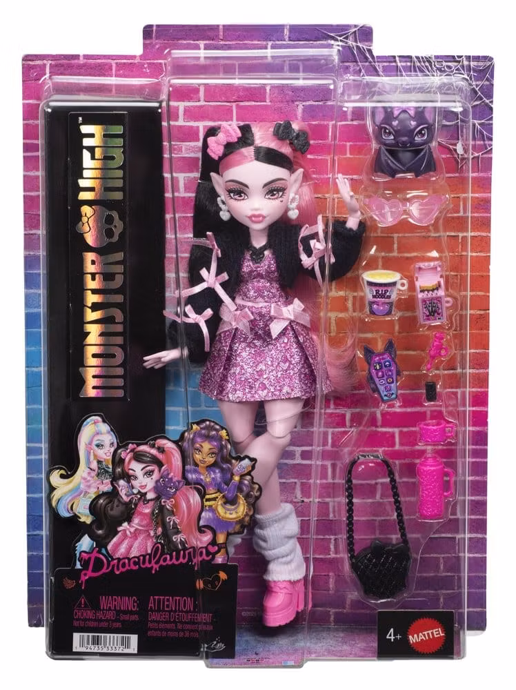 Akta dig för gåshud: stilen på denna Monster High-docka är helt enkelt vamptastisk! Draculaura-dockan ser helt bedårande ut i sin rosklänning och kommer med sju accessoarer. Hennes trogna följeslagare är Greve Fabulous, som alltid är redo för skrämmande äventyr med en bit! Barn från 4 år och uppåt kommer att älska att hemsöka rummen på Monster High med denna positterbara Draculaura-docka. Fullt posérbar. Dockan kan inte stå på egna ben. Färger och mönster kan variera.