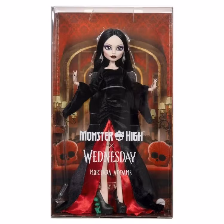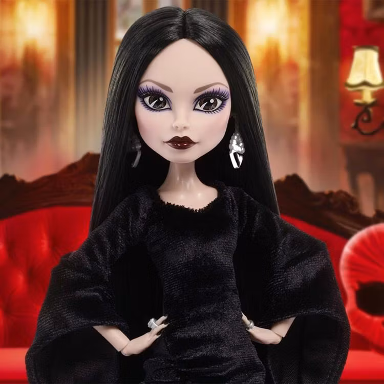 Mattel partnered with the makers of the hit series Wednesday to create a chillingly beautiful line of dolls inspired by its iconic characters. Dressed to haunt in her signature look from the show’s second season, Morticia Addams, the morbid matriarch of the beloved family, is a must-have skullectible for fans. Draped in a cascading floor-length black gown, with a high slit that reveals a pop of blood-red satin lining, her look is giving gore-geous gothic in all the best ways.