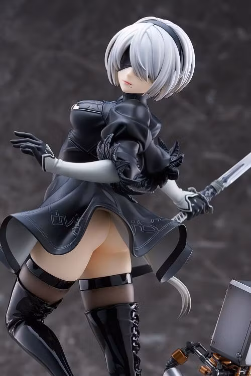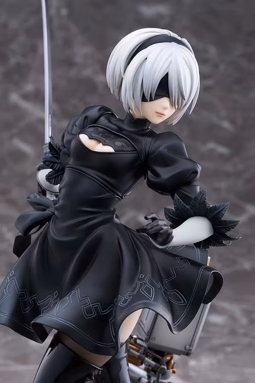 Noggrann uppmärksamhet har ägnats detaljerna i figuren, såsom skulpteringen av 2B:s slanka men ändå starka kroppsbyggnad, outfitens matta finish och stövlarnas lyster.