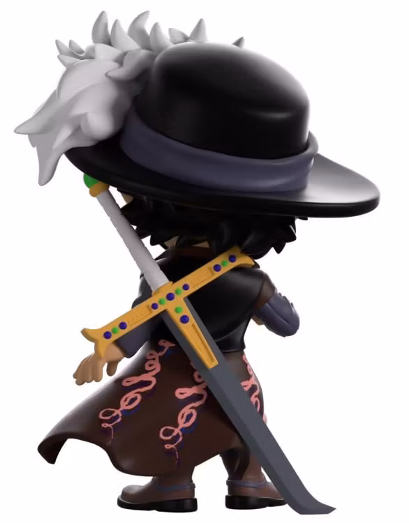 Slicing his way into Youtooz with absolute ease, Mihawk arrives to nonchalantly make his debut! Standing at 4.8 inches tall while holding a small knife in his outstretched hand, his serious face is framed by an angular beard with a sharp pointed mustache as a plumage of white feathers flow over the brim black hat atop his head. He is wearing baggy pink pants that are tucked into sturdy boots and a long open brown coat that shows off his muscular torso, his gigantic elegant sword is strapped to his back. The exterior of his packaging shows a beach littered with explosions as a flaming ship sinks in the background. While the interior shows a vibrant blue crashing wave sending white sea foam skywards in front of a beautiful pale yellow background, this design then flows onto the protective sleeve where his figure can be seen through the large clear display window at its front. This collectible ships in a matte, embossed, protective outer sleeve and a custom-sized plastic protector for maximum protection during shipping.