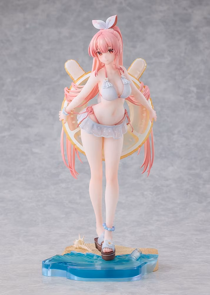 Popular illustrator Rosuuri's original character White Rabbit Rosu is now a scale figure in her summery swimsuit! Rosu wears a bashful smile that is sure to steal your heart. Her translucent skin, fluttering pink hair and rabbit ear ribbon accessory all work hand in hand to bring out her adorable charm. Her frilly white bikini and translucent rabbit-shaped swim ring give the figure a refreshing beach-like feel just like the atmosphere of the original illustration. Other details such as the seashells and beach bottles have been carefully sculpted and added to the base, which can be connected to the base that comes with Cheshire Cat Mika: Swimsuit Ver. Be sure to add Rosu and Mika to your collection!