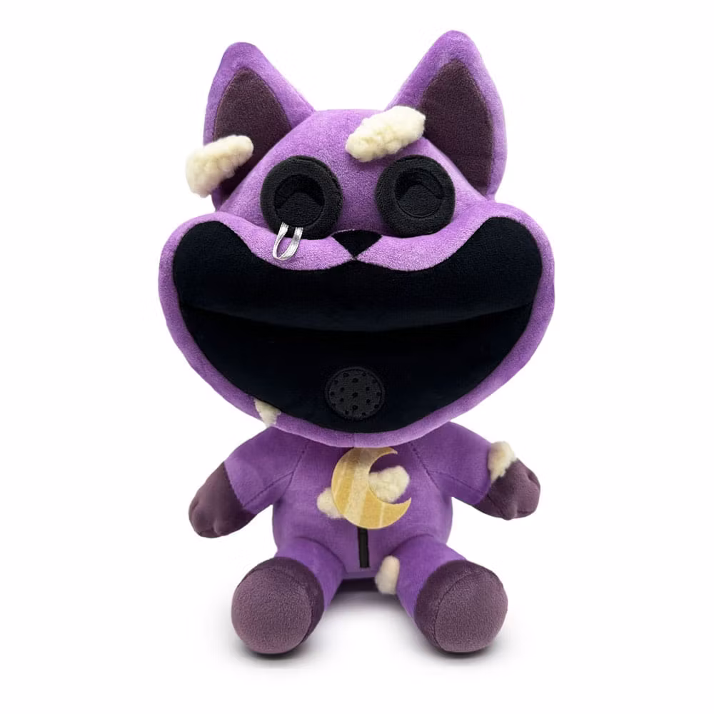 Catnap is back but this time not from a nap, but a catfight! Sitting at 9 inches tall with their huge open mouth stretching into an unnerving wide smile that reveals a small air tube, dark round eyes adorn their purple face underneath long pointed ears. With a golden yellow crescent moon on their chest as long arms and legs stretch out from a rounded body, their hands and feet are a darker purple and a rounded tail extends from their back. Run down and in ruin, their body is speckled by cut marks with stuffing poking out from within as a loose string dangles from their right eye. This plush is packed to the seams with 100% PP cotton and is made of a mixture of minky, sherpa and felt materials along with draw string detailing, absolutely perfect for cuddling and taking a cat nap with... forever!