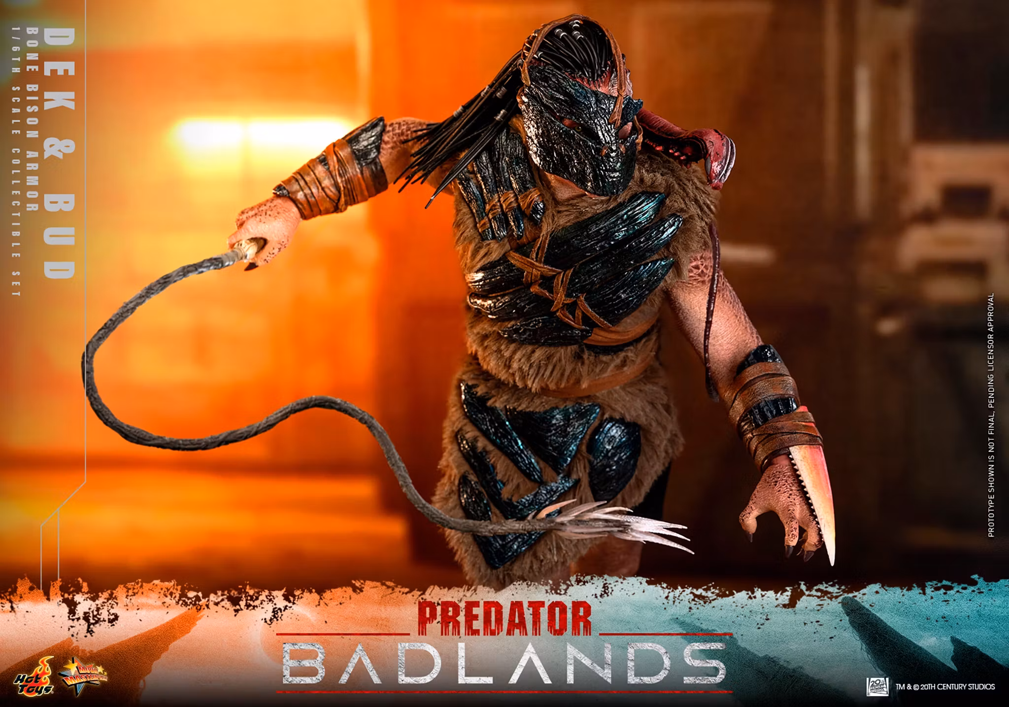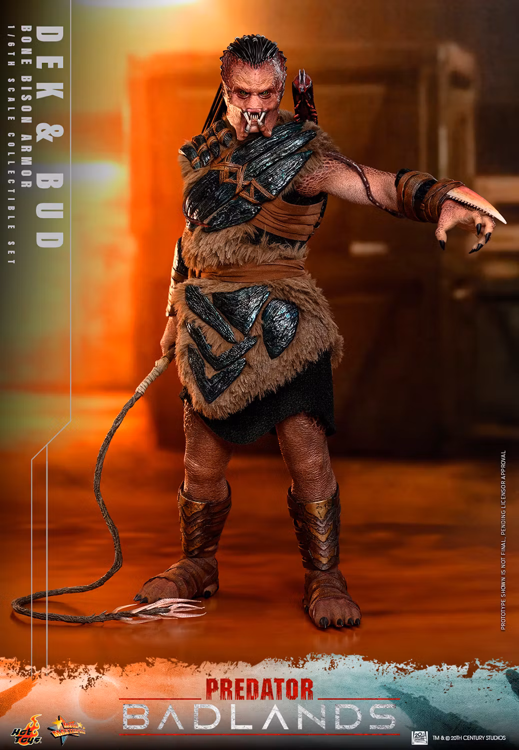 Hot Toys are thrilled to expand our Predator: Badlands collection by introducing the Dek (Bone Bison Armor) and Bud Collectible Sixth Scale Figure Set! The Dek (Bone Bison Armor) Sixth Scale Figure features a finely crafted head sculpt with separate rolling eyeballs, sculpted black slicked-back dreadlocks, and two sets of interchangeable mandibles to bring Dek’s fierce expressions to life. Dek’s physique is accurately represented by a specialized body utilizing soft vinyl material across the neck, upper chest, arms, and legs for a seamless joint design. His striking Bone Bison Armor is expertly crafted over brown fur fabric cloth and a black tunic, accented by greaves and wrist gauntlets with a Luna Bug fang wrist blade on the left gauntlet, and an attachable Bone Bison mask to perfectly complement the primal aesthetic.
