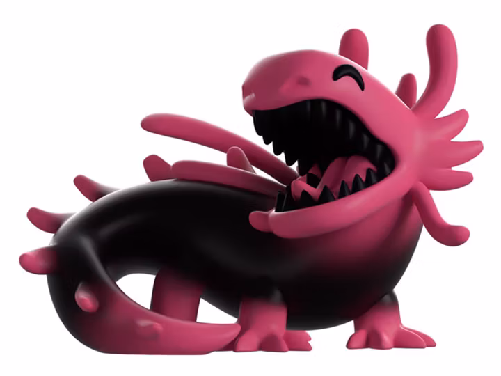 Oh no, we've become the new hunting ground of the Pink Lizard with their Youtooz debut! At 3 inches tall with a long pink and black gradient body snaking around as they open their mouth to reveal a series of pitch black teeth, their rounded nose leads down to thick frills at the back of their heads as blunt spines stretch all the way down theory back onto a curled tail. The exterior of their packaging sees them standing atop a metal ledge as thick vines wrap through the dilapidated structures in the distance, these then weave their way into the interior to surround them completely. The protective sleeve casts the ruined world in a green haze as their figure can be seen through the large clear window at the packaging's front. This collectible was designed in collaboration with community member @therealracckun and ships in a matte, embossed, protective outer sleeve and a custom-sized plastic protector for maximum protection during shipping.