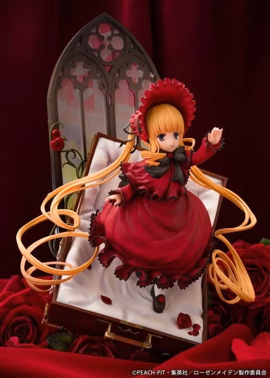 From the TV anime Rozen Maiden comes a figure of Shinku! The noble red rose maiden, Shinku has been portrayed with a sophisticated design and a focus on using rich colors that exude elegance. The stained glass backdrop is an optional display.