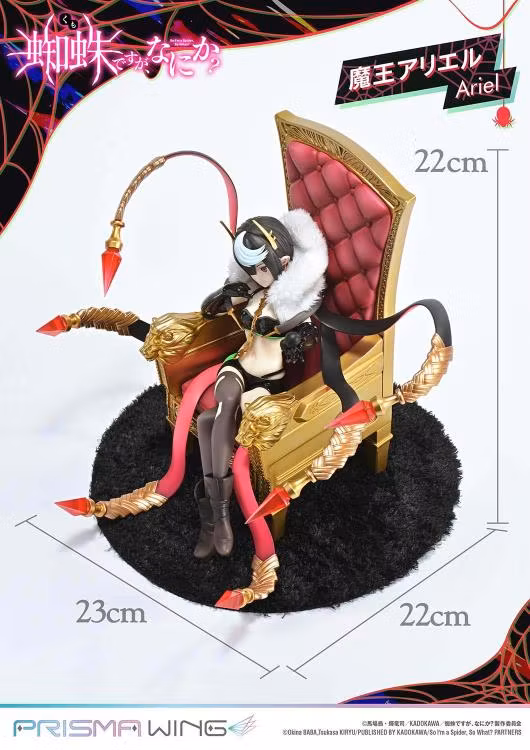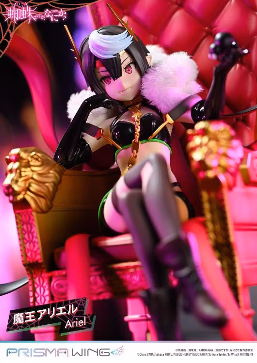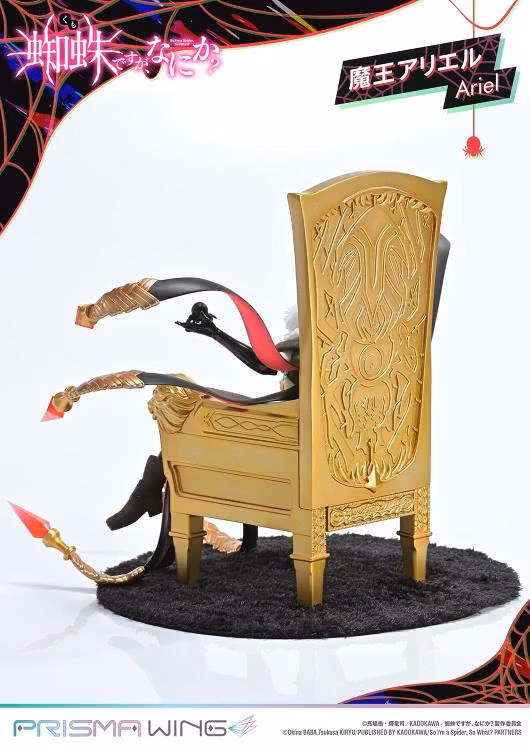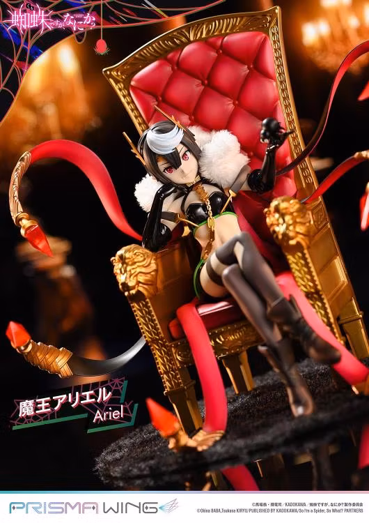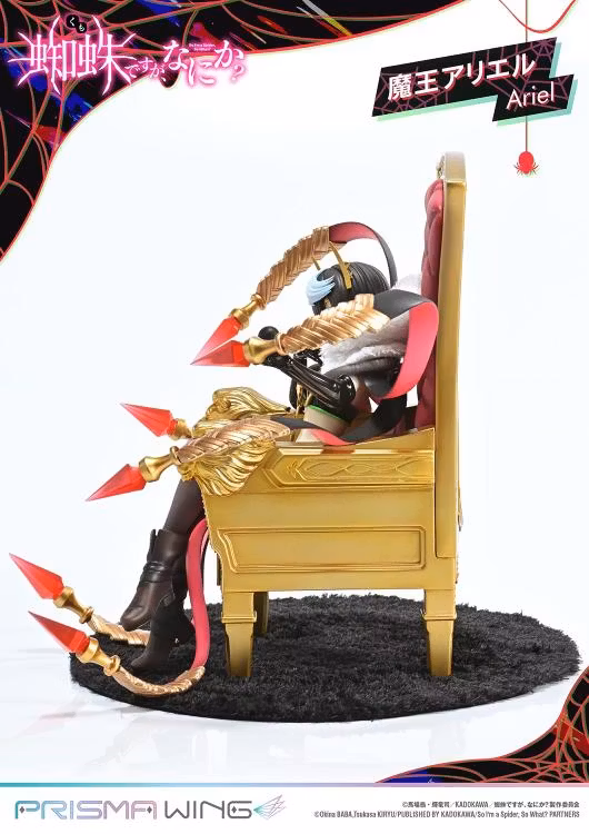 The throne she rests upon is an original PRISMA WING design. The armrests feature a lion's fierce gaze, the deep red backrest evokes the feel of fine leather, and the intricate spider sculpture on the back commands attention-truly fit for a Demon Lord. Additionally, a spider based on her underling monsters is included as an accessory. Place it in her hand or at her feet for added display options.