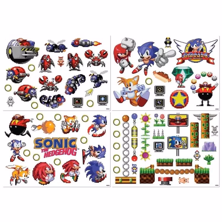 Med karaktärer, symboler, badniks och samlarobjekt; denna uppsättning av fyra ark av Sonic the Hedgehog-teknikdekaler är i retrostil, vilket anspelar på det ikoniska spelets ursprung på 1990-talet.