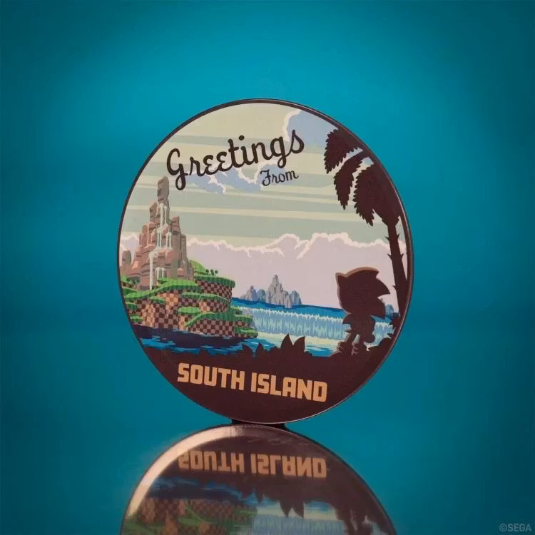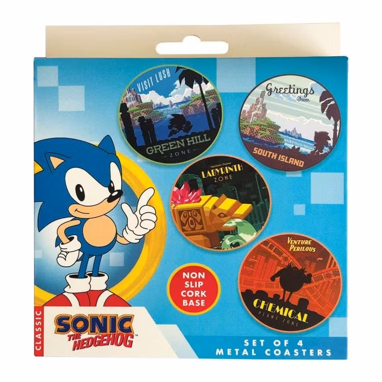South Island, Chemical Plant Zone, Labyrinth Zone and of course, Green Hill: all iconic locations in the world of Sonic the Hedgehog and all represented in this set of printed coasters. Made out of tin with a non-slip cork base.