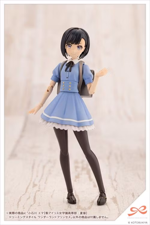 The Dreaming Style version of Emma features her outfit in an Alice in Wonderland themed blue Her skin comes in a lighter color than the standard version and is the same color as YOMI Black Canvas. *The skin color is also the same as skin color C from the Megami Device series. *This is a limited edition item and is only available in limited quantities from select retailers. *The background card will be sent with the product for online purchases or given at the register for physical purchases. *The background card is a Kotobukiya shop exclusive in Japan. Braided Bangs The kit comes with limited parts featuring a set of braided bangs that was introduced in a live stream on the SOUSAI SHOUJO YouTube channel. A standard type and a type for glasses are included. Emma's Room Background Card A newly drawn background card featuring Emma's room with a couple of Kotobukiya's plastic models on display and a drawing tablet for Emma is included. Combine them with the separately sold After School kits and other props for more fun! *Product size: A3 (297 mm x 420 mm) The actual product will be delivered folded in half (A4 size). Light Skin Color Her skin comes in a lighter color than the standard version and is the same color as YOMI?Black Canvas?. *The skin color is also the same as skin color C from the Megami Device series. Pre-Painted Face Parts Emma comes with four different face parts, Smiling, Shouting, Upset, and Disgusted, each painted and unpainted. Her eye color is changed to blue in the dreaming style version. Use the included decals with the unpainted face parts to change her line of sight! Small, Slender Body Emma is 140cm tall, the smallest in the series. Her new size is definitely one of the highlights of this model. She also has smaller feet to stay in proportion with the body. She can be displayed with her shoes off, too. The ball joint in the neck is designed to slide back and forth, allowing for a greater range of expression. Use the 6mm ball joint to combine with Megami Device models as a 14cm body in a uniform. 11 Hand Parts The kit includes 11 types of hand parts, including four new: holding (drawing tablet), holding (tablet computer), holding (game controller), and cool open hand. Twisted Torso This torso part allows the model to twist her body at the waist and extend her right arm forward, greatly expanding the number of potential poses. The white collar is pre-painted. Skirt Parts The white lines on the skirt that were pre-printed in the Ritsuka Saeki model, are now separate parts for the standard and flowing skirts. They come in three different shapes: standard, flowing, and sitting while hugging knees. Body for Sitting While Hugging Knees This special body part allows Emma to sit with her knees to her chest. The body is to be used with the regular head, arms and feet. Array of Accessories As Emma aspires to be a god-like artist, the kit includes a tablet computer and drawing tablet for drawing poses. The back of the tablet computer features a certain emblem. The smartphone comes in two versions, standard and gaming modes, with the beloved HEXA GEAR logo on the back. The St. Iris Gakuen Girls' High School bag features a removable school emblem covering a 3mm hole that can be used with flying bases. Five hair accessory parts for the various bangs are also included. Included Items: 1. Emma Koishikawa Model ×1 2. Hair Style Parts ×2: Wavy Long, Twintails, and Buns *The buns and twintails cannot be assembled at the same time, as they use the same base connection part. 3. Bang Parts ×6 Types, 1 Each: Braided (Standard), Braided (Glasses), Headband (Standard), Headband (Glasses), No Headband (Standard), No Headband (Hair Accessories) 4. Face Parts (Pre-Painted): Smiling, Shouting, Upset, Disgusted 5. Face Parts (Unpainted): Smiling, Shouting, Upset, Disgusted 6. Hand Parts ×11: Holding (Drawing Tablet), Holding (Tablet Computer), Holding (Game Controller), Cool Open Hand, Holding (Standard), Holding (Tight), Holding (Open), Holding (Rounded), Gripping, Pointing A, Open 7. Twisted Torso Part ×1 8. Knees to Chest Part ×1 9. Skirt Parts ×3 Types 1 Each: Standard, Flowing, Knees to Chest *The Knees to Chest Skirt is to be used with the Knees to Chest Body. 10. Shoes Off Parts ×1 Set 11. Tablet Computer ×1 12. Drawing Tablet ×1 13. St. Iris Gakuen Girls' High School Bag ×1 14. Hair Accessories ×5 15. Display Base ×1 16. 6mm Diameter Neck Part Compatible with Megami Device ×1 17. Face Decals ×1 Sheet 18. Newly Drawn Emma's Room Background Card ×1 Sheet