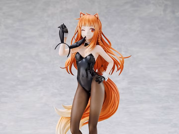 The figure features Holo clad in a bold bunny suit based on a newly drawn illustration by the original light novel series' illustrator, Jyuu Ayakura.