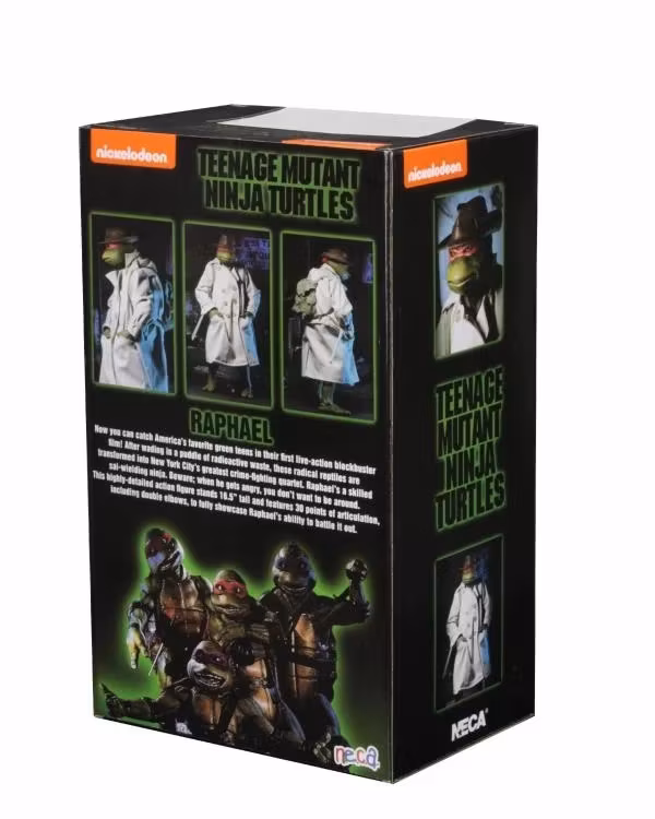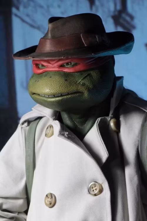 NECA:s senaste actionfigur i skala 1/4 från Teenage Mutant Ninja Turtles-filmen från 1990 är Raphael i den förklädnad han använder för att passera genom staden obemärkt. Han bär en trenchcoat i tyg och en skulpterad hatt och ryggsäck, som alla är avtagbara.