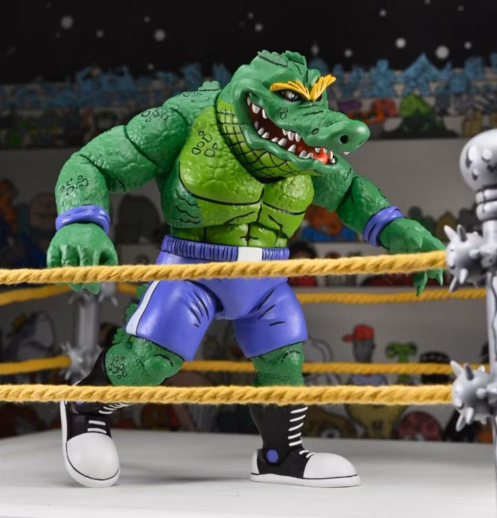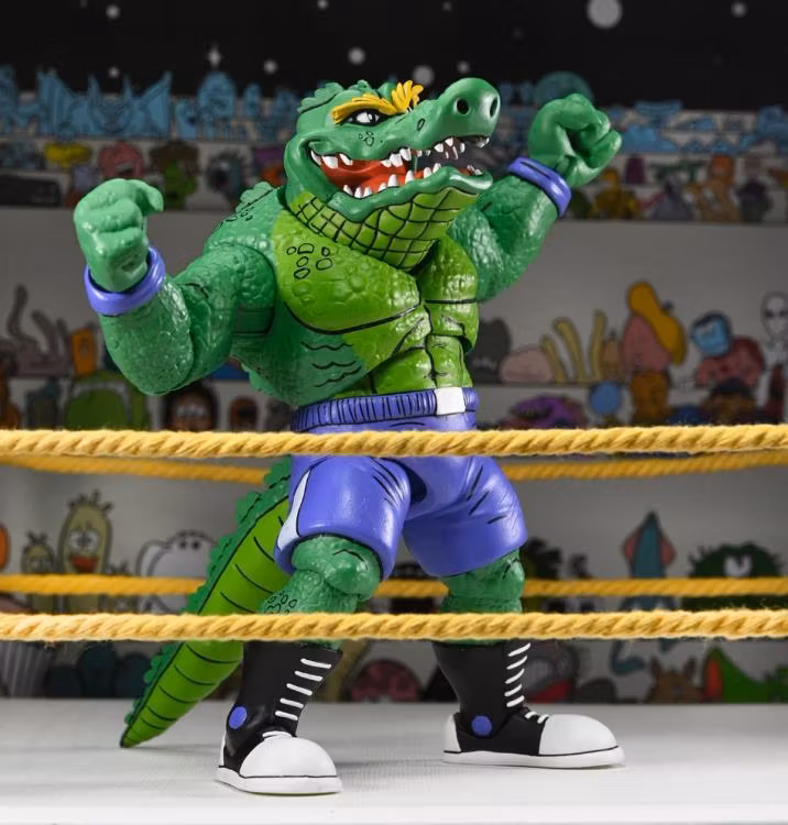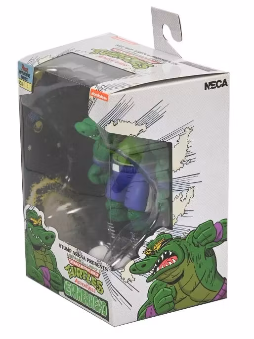 This 7-inch scale Stump Wrestling Leatherhead action figure by NECA features a hinged jaw to chomp the champ and a bendy wire tail to bash turtle brains! It also includes extra hands and comes in reliable window box packaging with original box art by Ken Mitchroney.