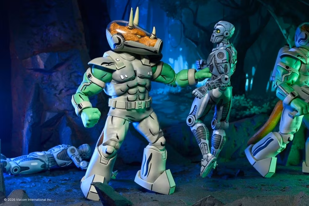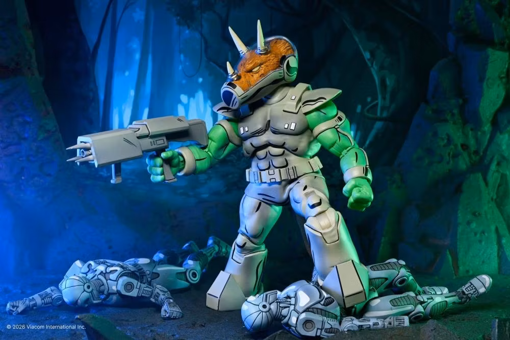 Invasion! Triceraton-republiken har anlänt. NECA skickar in Shock Commandos med denna lyxiga Triceraton-actionfigur, som syns i nummer #5 av Eastman & Lairds Teenage Mutant Ninja Turtles-serietidningar från Mirage Studios!